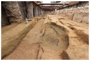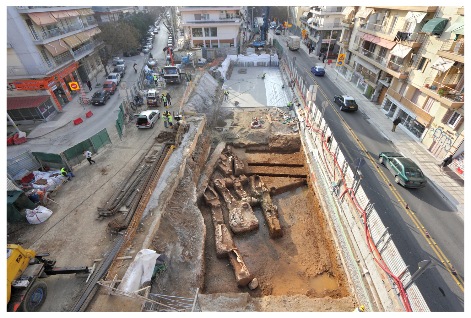 The alignment of the Thessaloniki Metro, which crosses the city’s center, follows the axis of the main street of the ancient city urban fabric, a 16m-wide street framed by rows of columns and arcades.